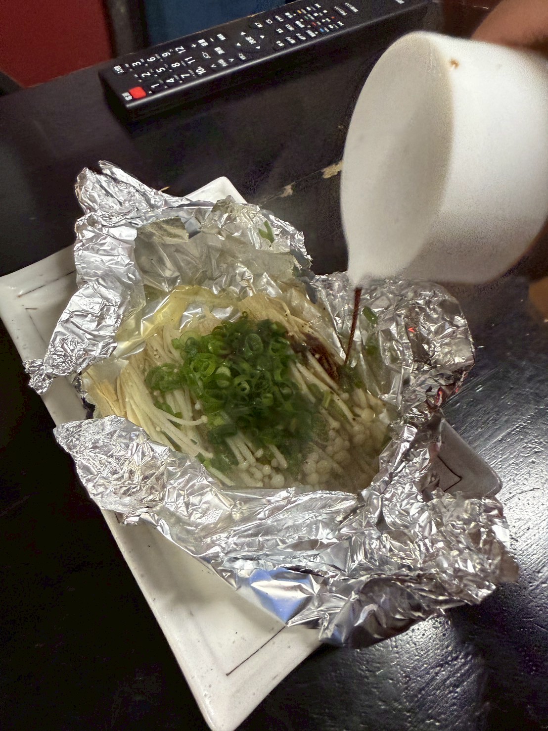 バターで蒸し焼きにされたえのきに醤油をたらり