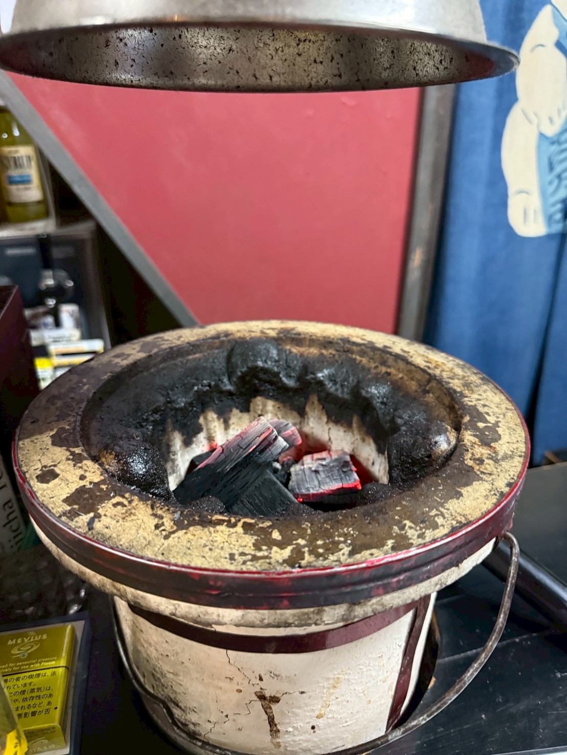 カウンター席に座らせてもらうと、早速七輪がお出迎え。