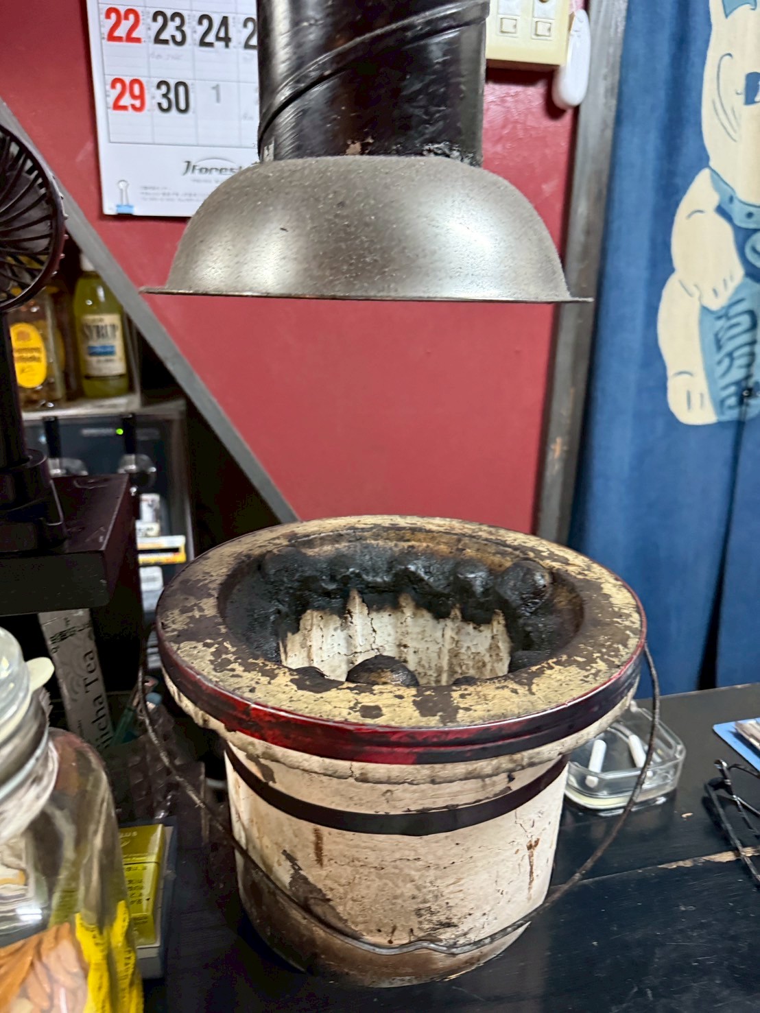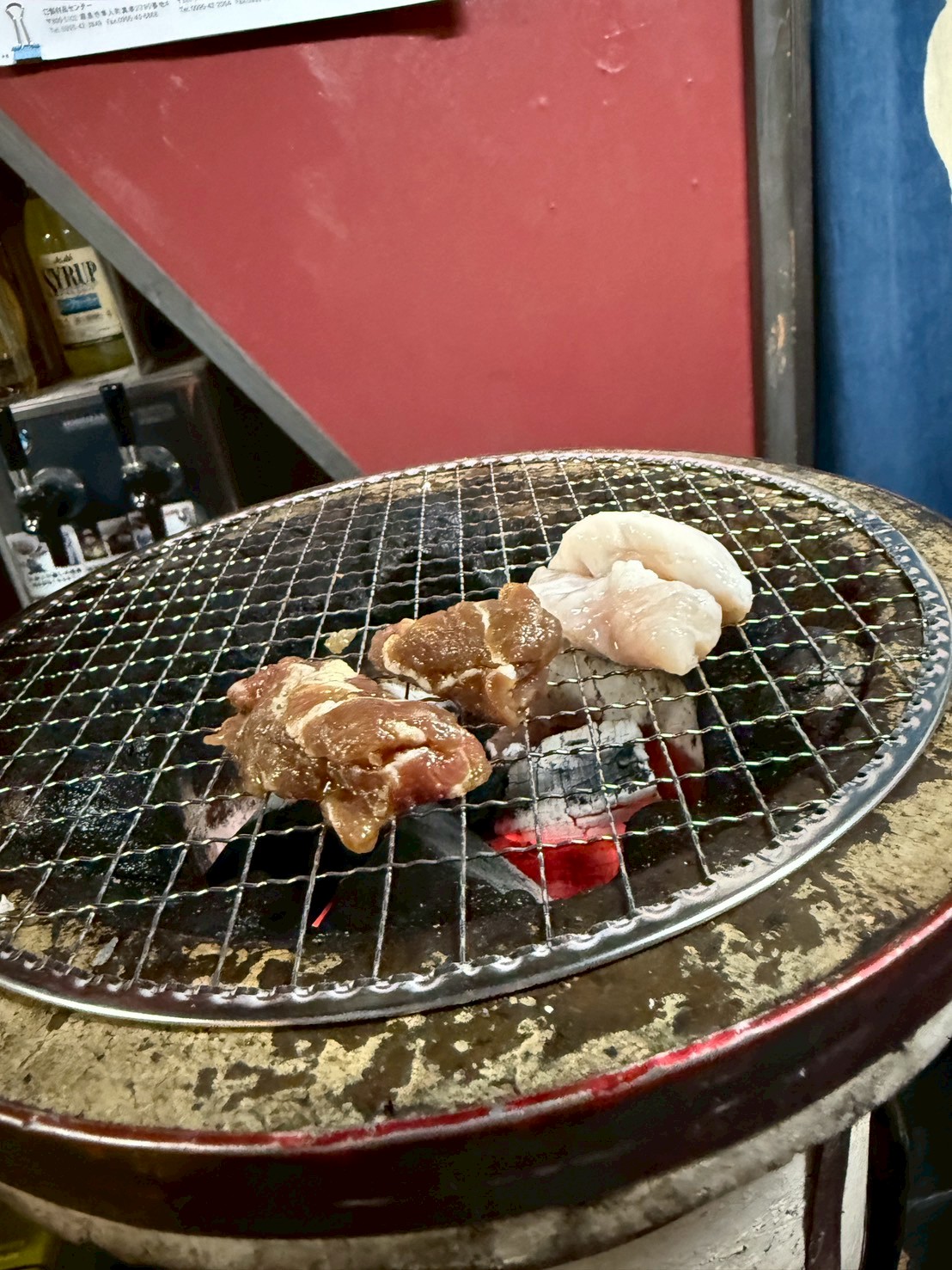 使い込まれた七輪にこれから炭が投入されて、網の上でホルモンが焼ける
