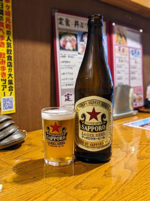 ごくんっ……ごくんっ……ごくんっ……、うまっうまっうまっ! ほんのり、店内に何か香ばし匂いが充満していて、これを嗅ぎながらの赤星瓶ビールは最高でしかない。よし、この香りの元を訪ねよう。