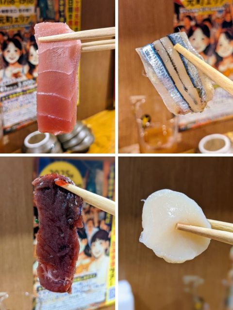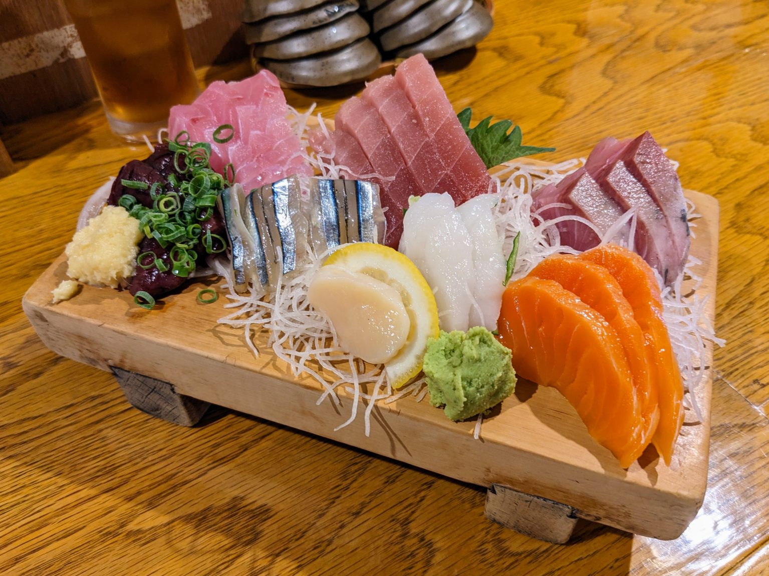 出たっ『刺身(小)』破格の1,650円! この値段でこの内容?と、まずは目を疑う。サーモン、ブリ、エンガワ、ホタテ、マグロ、キビナゴ、マダイ、クジラまであるぞ。小とは名ばかり、まるで海の玉手箱。