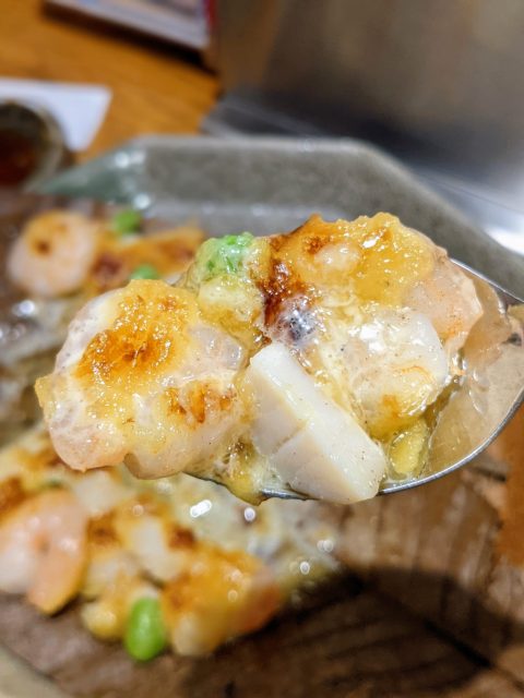 まずやってきたのが『海鮮一里塚焼』だ。燻された大きな葉の上に、海老、イカ、枝豆、そしてそれを覆いかぶさるトロォ~リチーズ。そこには秘伝のタレが潜んでいて、香ばしさと旨味が上手に絡み合っている。