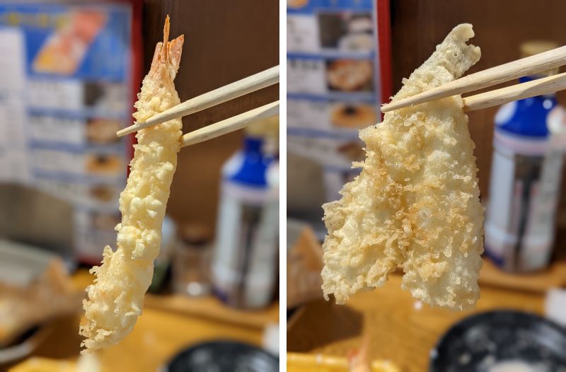 海老、キス、ナス、マイタケの『天ぷら』オールスターズ。衣は薄く、油は軽やかサックサク。