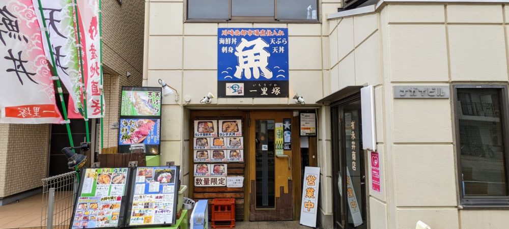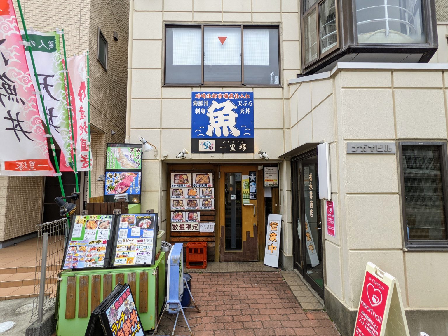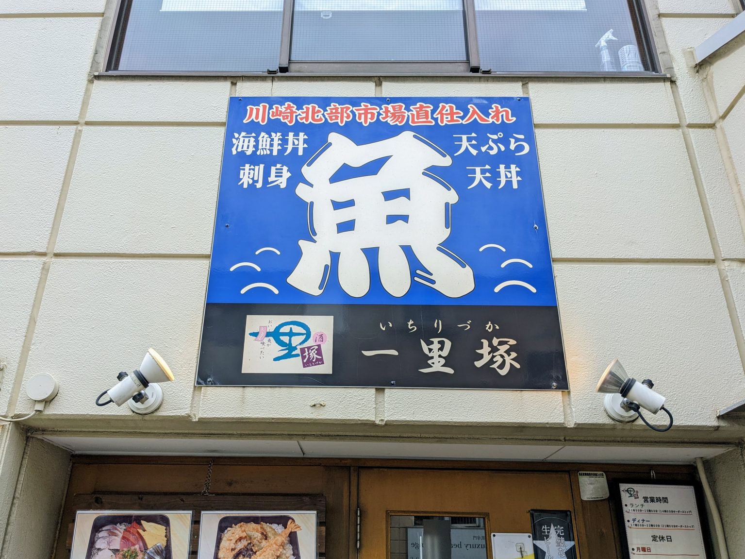 その名も『一里塚』だ! モルタル低層ビルの一角に〝魚〟と大書された看板が目印。店先にはいくつもの暖簾と置けるところに目いっぱいに置いたメニューボード。