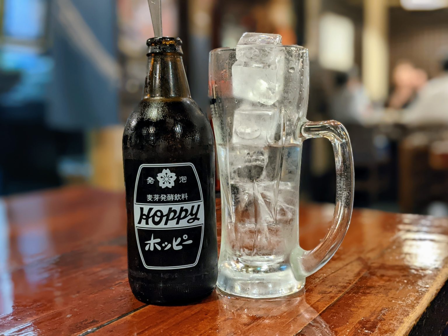 ここはやはりホッピー。スリムジョッキに氷が強めで、水位は50%くらいか。そこへホッピー120ミリリットルを注いで、アルコール度数30%程度にチューニング。いい具合に仕上がったところを……