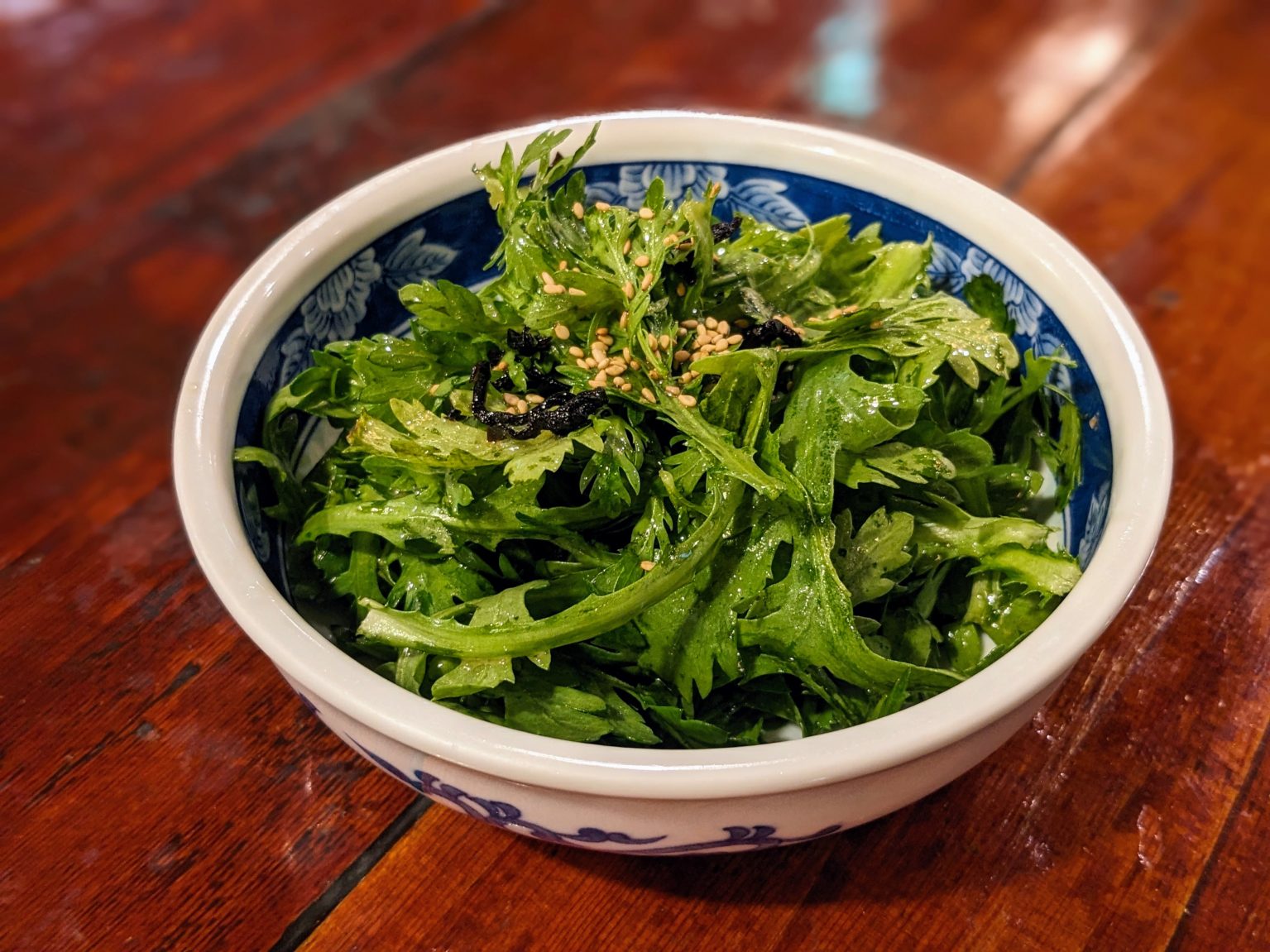 まずは「なんで今まで出会わなかったんだろう」と不思議な『春菊の塩昆布和え』から。そんな熟年恋愛のような驚きが、この春菊と塩昆布の邂逅にある。