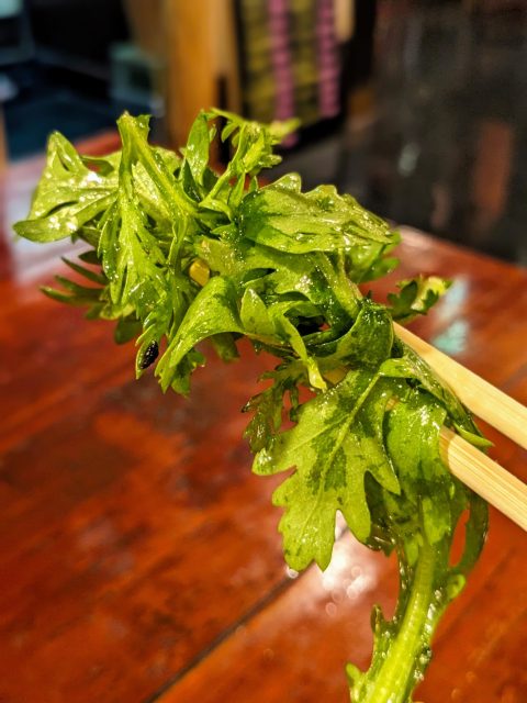 青々とした春菊の苦みを、塩昆布が優しく抱擁。これにはまいった。間違いなく草食系(くさ系)おつまみの中でダントツ一位の旨さ。ぜひとも世の酒場でも流行って欲しい。