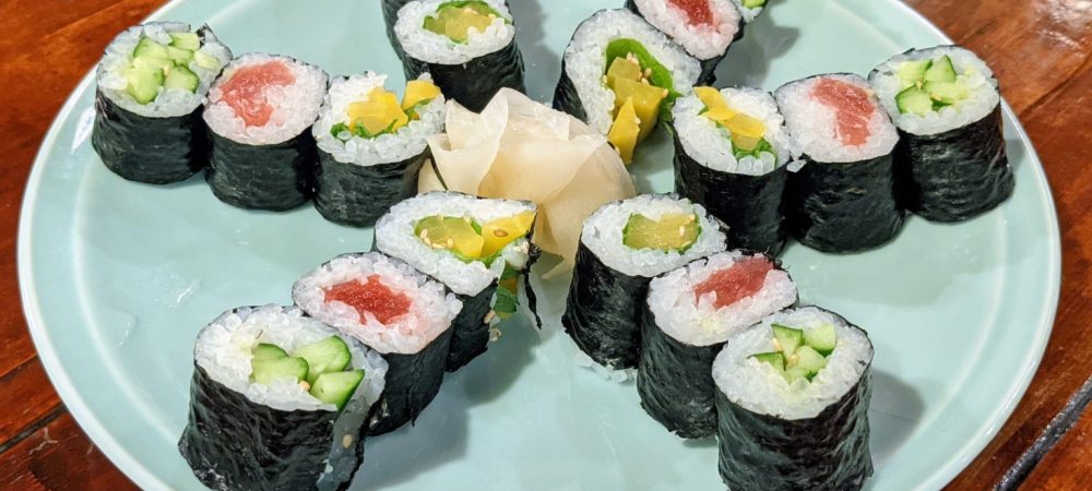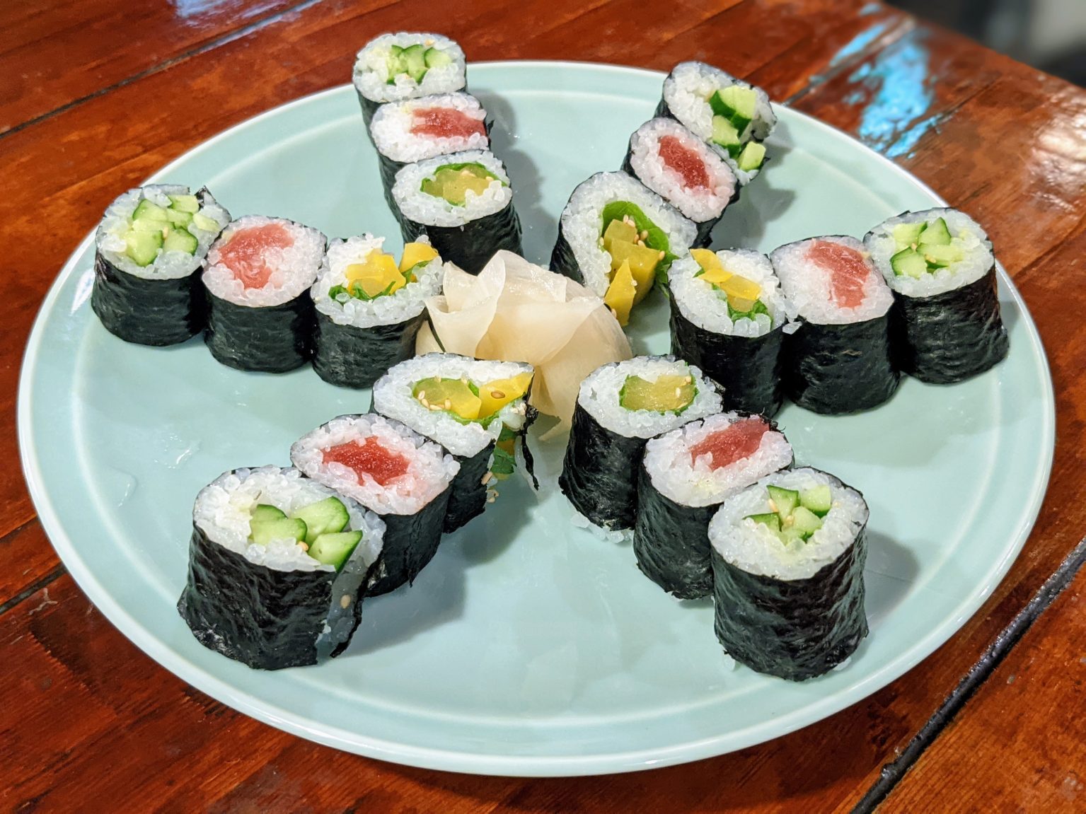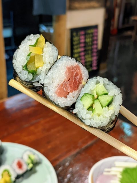 鉄火巻きの赤はこってりな赤身の旨味、きゅうり巻きの緑はシャキシャキと清涼感。沢庵巻きの黄は、ポリコリと食感が楽しい。