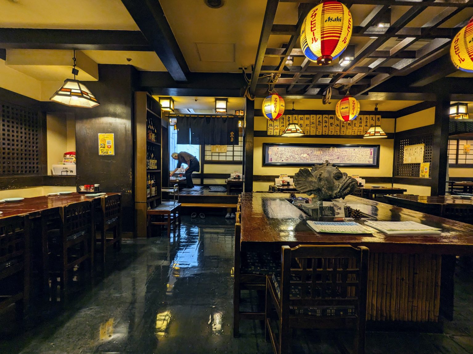 四方には広い座敷が伸びていて、パッと見ではどれくらい深いのか見当もつかない。ああ、これぞ大箱総合酒場……このワクワクする感じがたまらない! 他に客は一組だけ。もちろんどこに座ってもいいと言われたので、店の真ん中を酒座に決める。