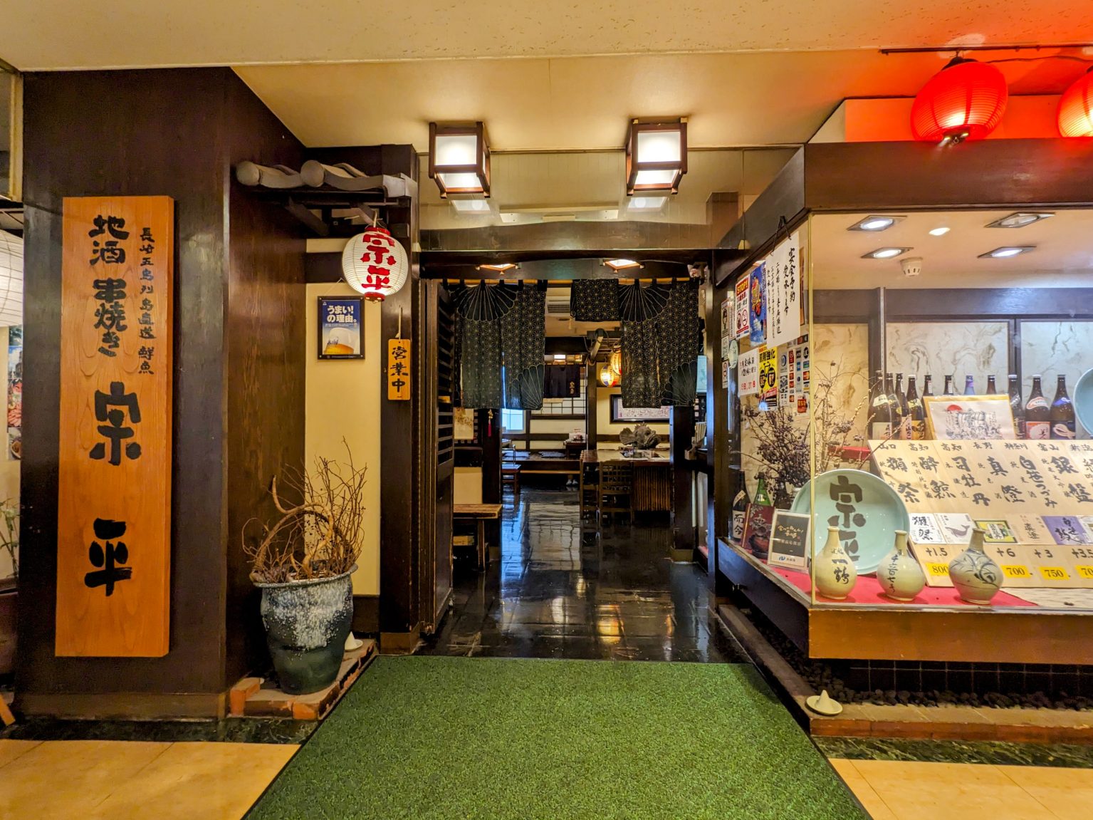 出たっ、『宗平』だ! 店先には全国の銘酒を並べた大きなショーケース。木目模様に塗り替えたビルの太い柱には、豪壮な木板看板。他はどこにでもありそうなレストラン街の店なのに、この一角だけ民芸風を醸し出している。中が楽しみだ。