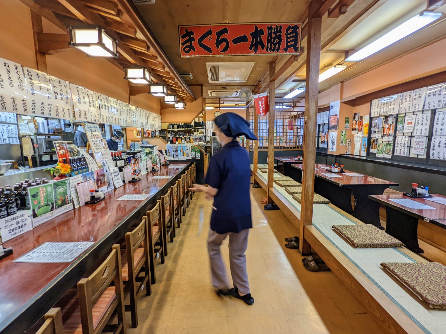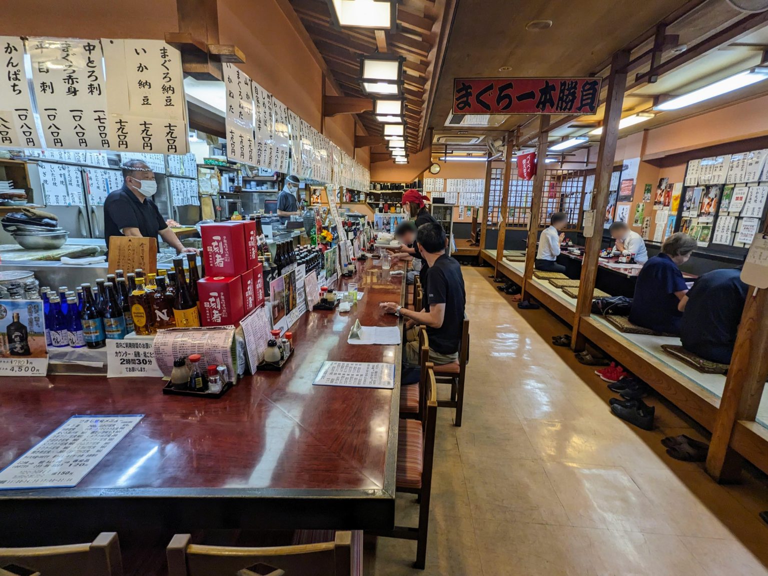うわっ、うわっ、うわ──っ! めちゃくちゃいい景色じゃないですか! ウッディで広い店内の半分はL字カウンター、さらに半分は小上がりが奥の方まで伸びている。