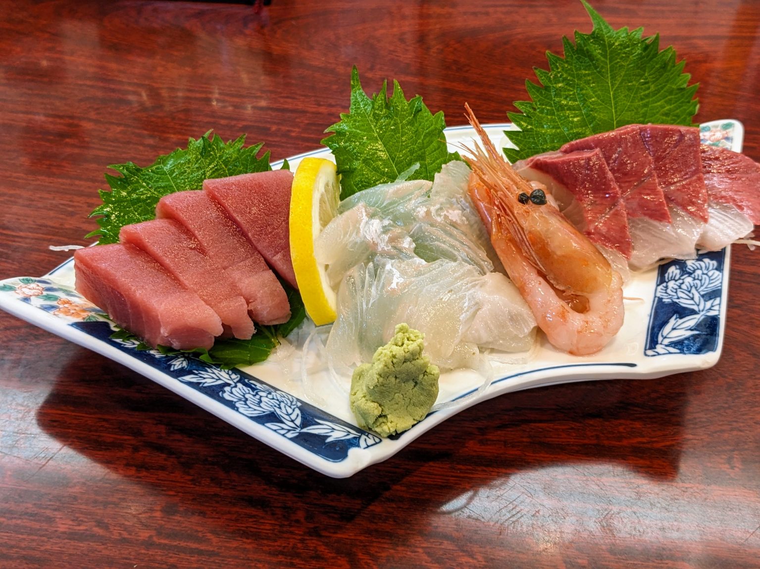 まずは『刺身四点盛り』から。本マグロ、ヒラメ、甘エビ、カンパチのオールスターは、誰もが認める贅沢盛り。そのどれもが鮮度が際立ち、ヒラメは風味豊かで、甘エビは極うまの甘みがとろりと広がる。