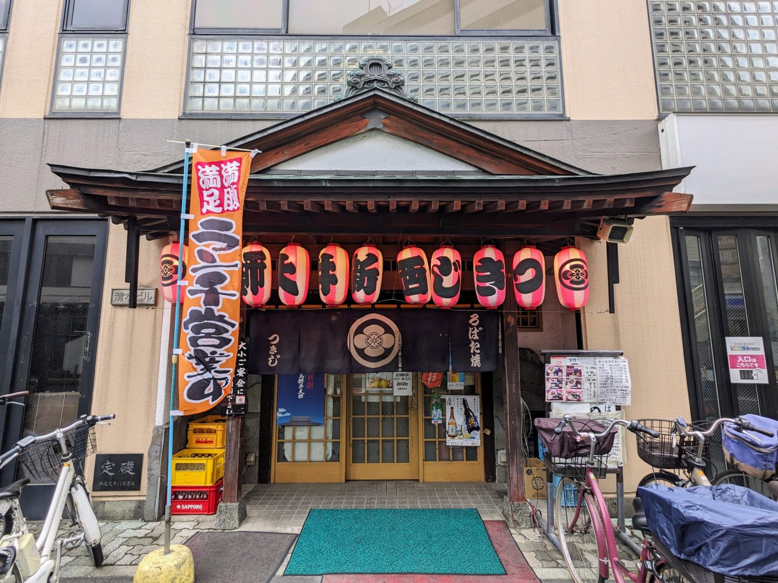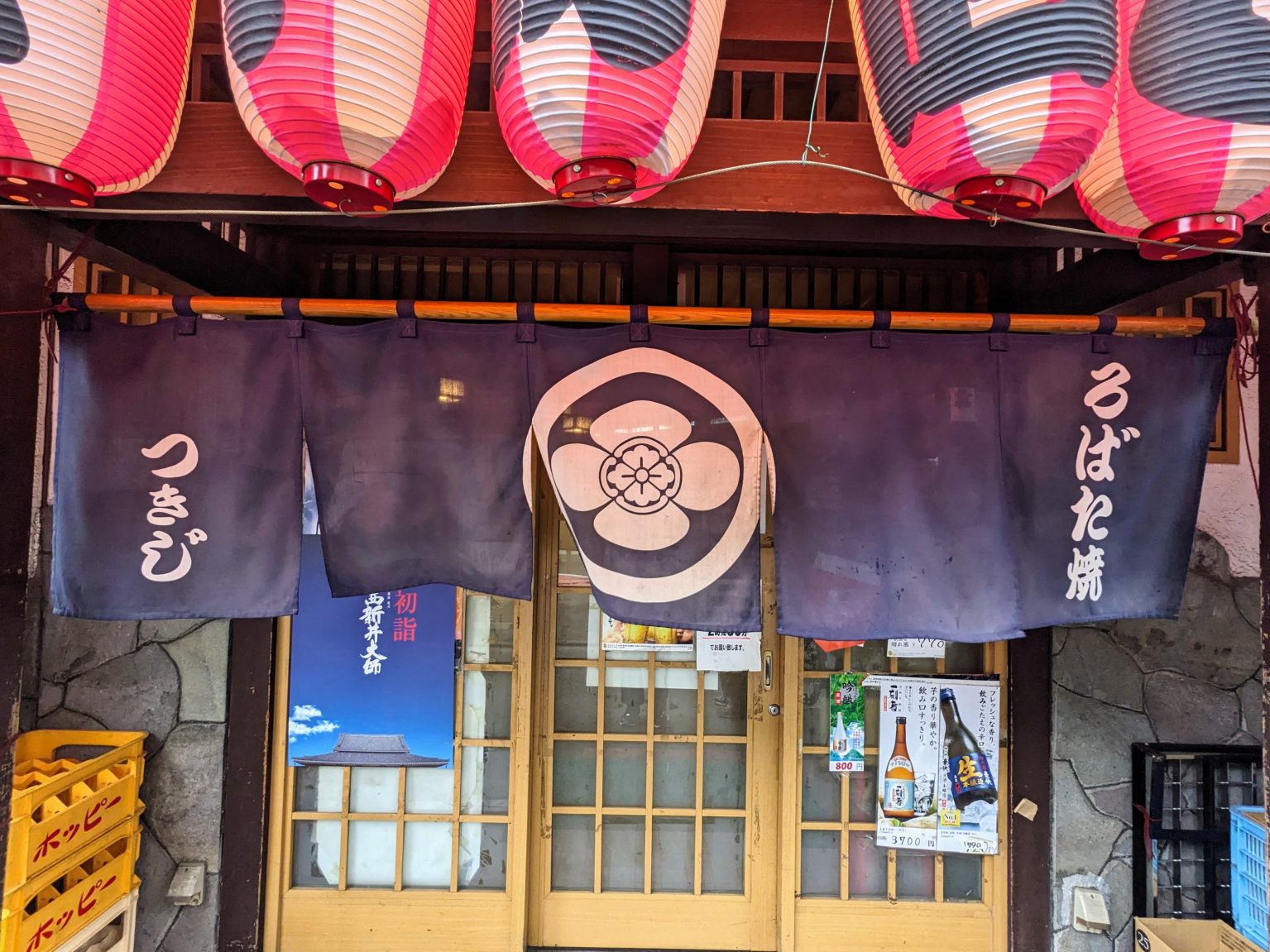 雑居ビルの一階部分に、宮造りの異色な店構え。出入口には日に焼けた赤提灯がずらりと並び、その奥にはデカデカと花菱紋が記された藍暖簾。