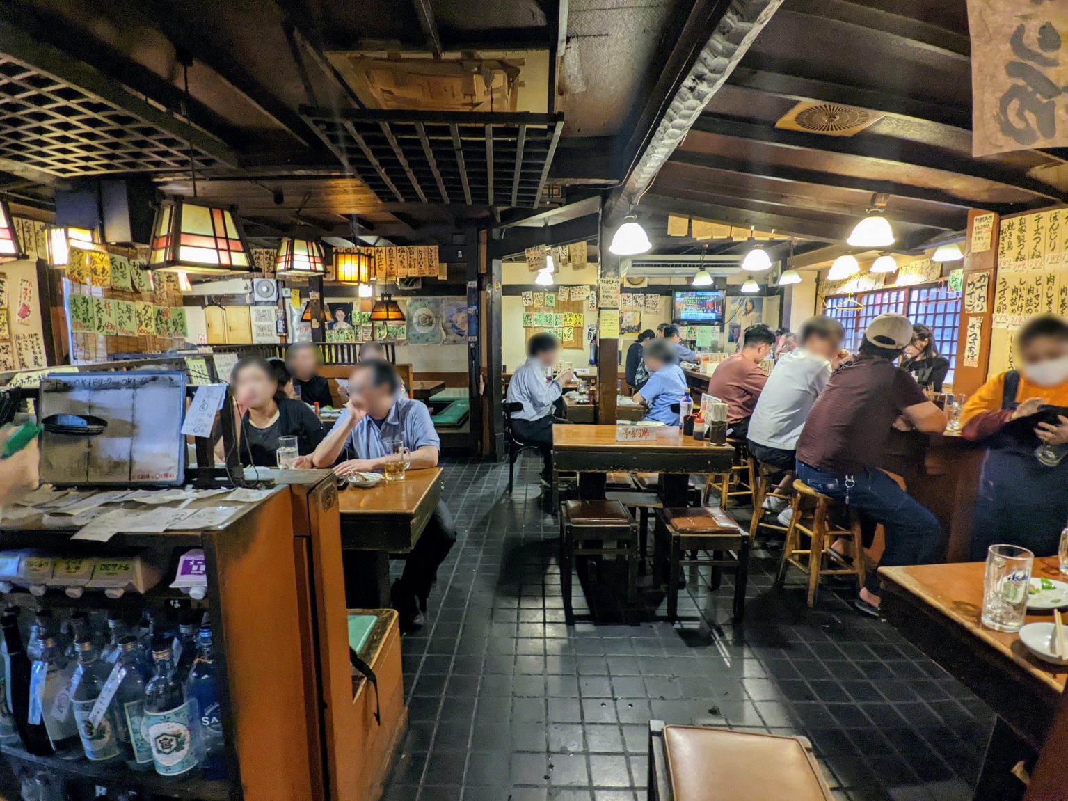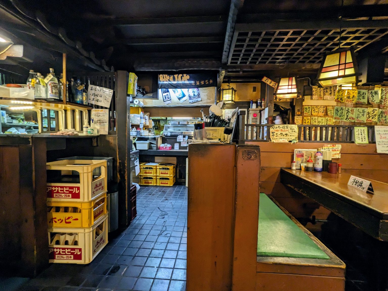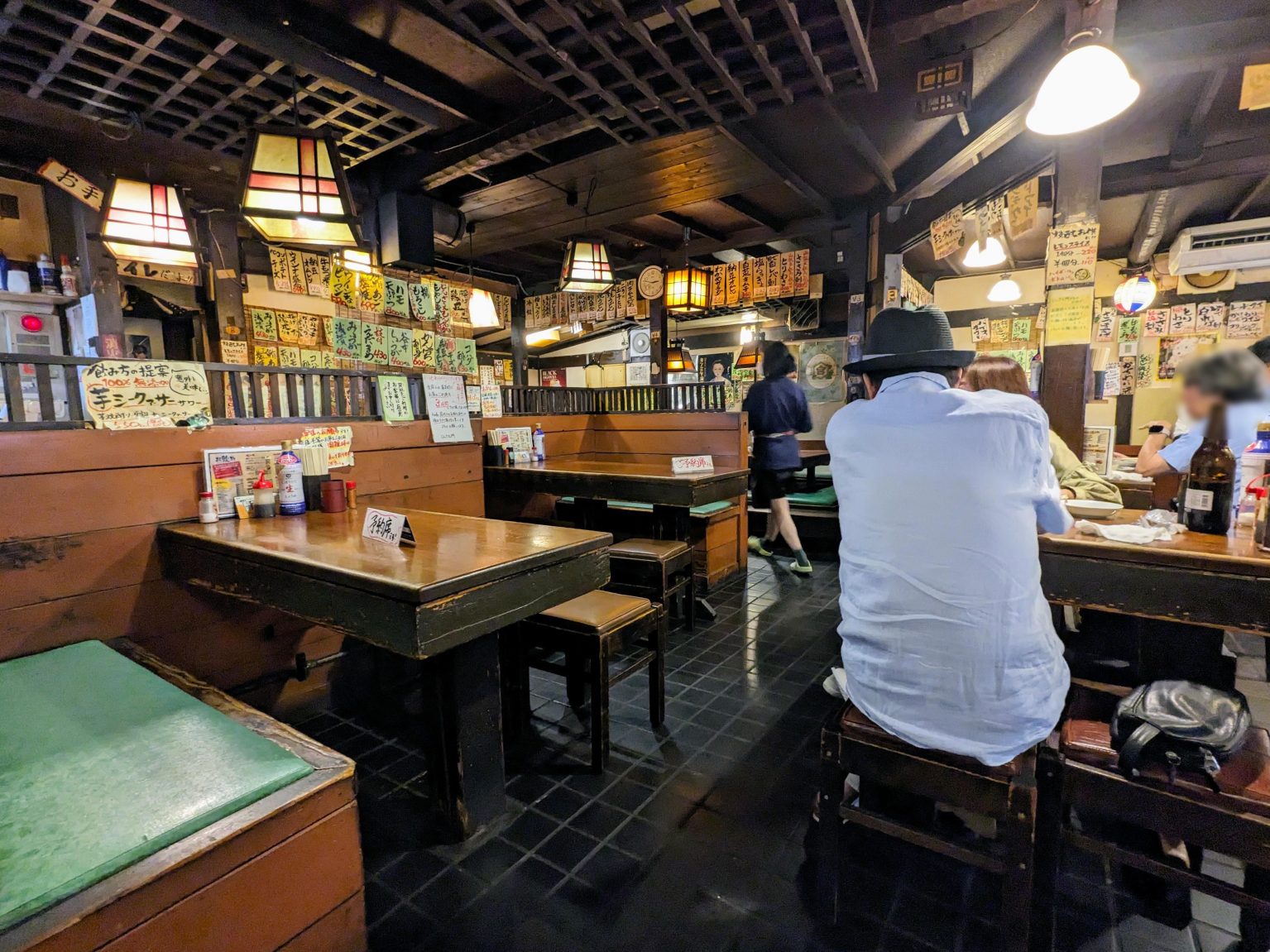 ワハハッ、中はもっとイイ! どこもかしこも茶色、茶色、焦げ茶色! レトロ照明にタイル床、経年劣化のテーブルと破れた四角イス。それらを包み込むウッディな内観は完全に民芸風で、奥の方からグルりと見た渡すところにろりますと、私の大好物ナソレでしかない。