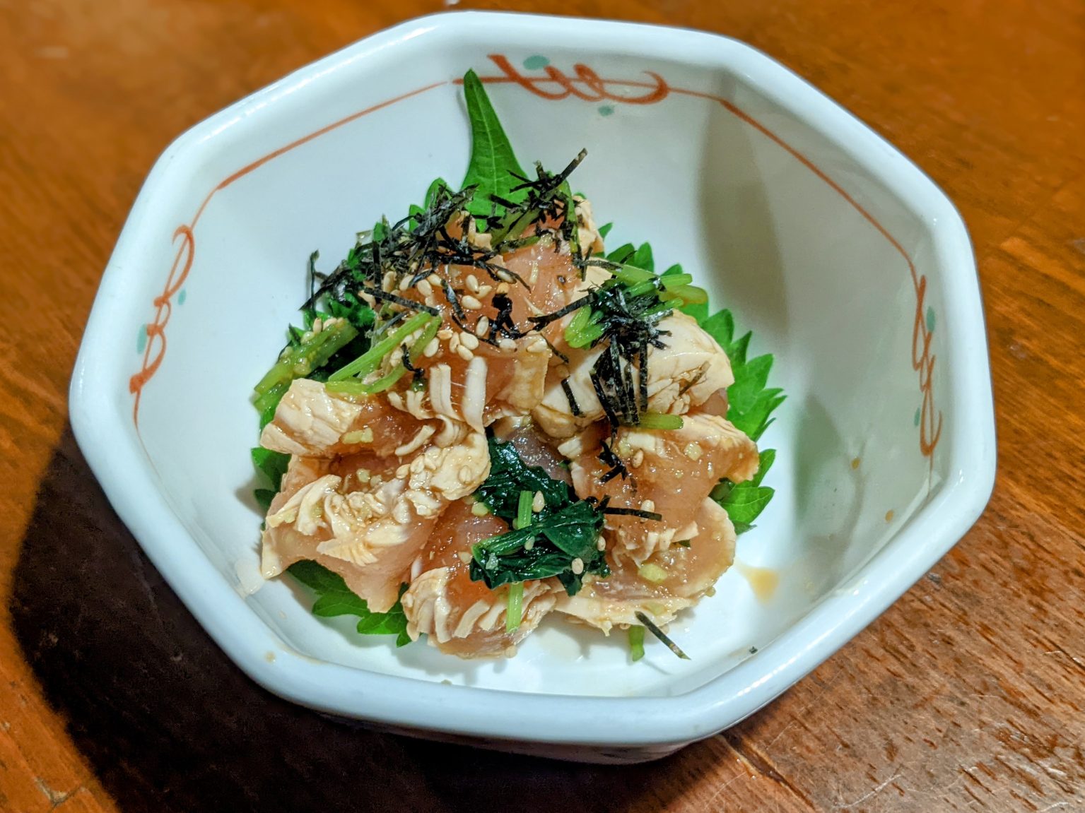 気をとり直して『とりわさ』だ。しっとりとした鶏の身に、わさびの清涼感がふわりと重なる。そこに忍ばせてあるのが、細かく刻まれたほうれん草。さらに刻み海苔としその葉と、この具だくさんの細工が味に奥行きを与えている。青菜のほろ苦さが、鶏の旨味を引き立てる……これは結構、コケコッコー。