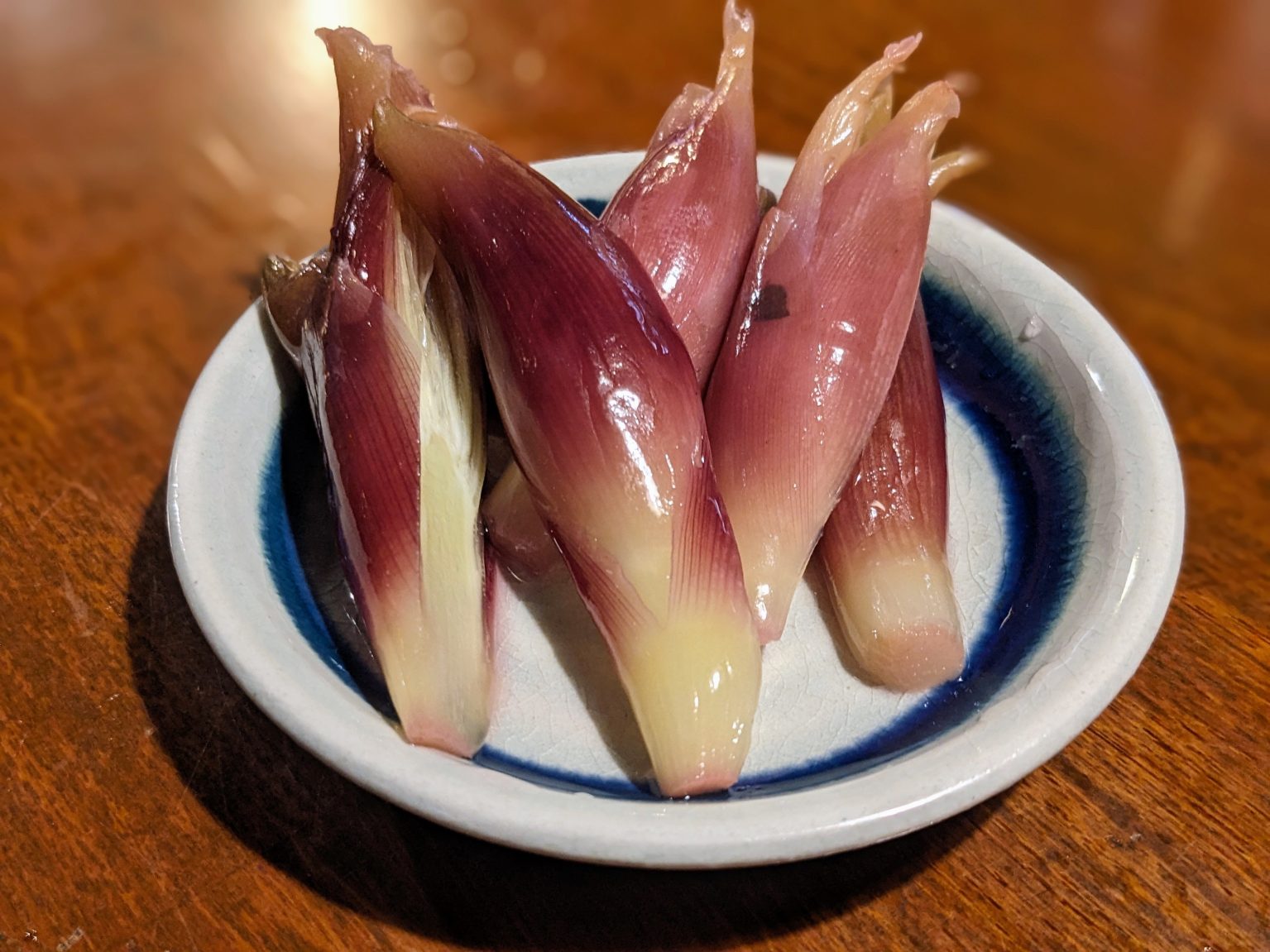 『ミョウガの酢漬け』の一皿は、まさに瞬間の妙(ミョウ)を味わうもの。漬かりが浅ければミョウガ特有の風味が立ちすぎて、深すぎればその風味が霧散してしまう。絶妙な食べごろを見極めるのは、まるで女性との終電間際のやりとりのような繊細さ。口に含めば、シャクッとした歯ざわりとともに、ほのかな酸味が心地よく鼻をヌける。この終電間際勝負、女性の勝ちだ。