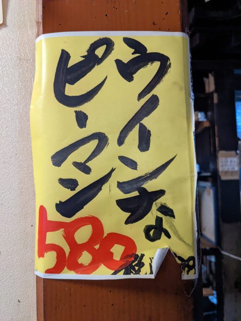 席の壁に張り付けてあった『ウインなピーマン』の文字。その名を聞いた瞬間、なんとなく想像がついた。ウインナーとピーマンを炒めた、あの定番の組み合わせ。