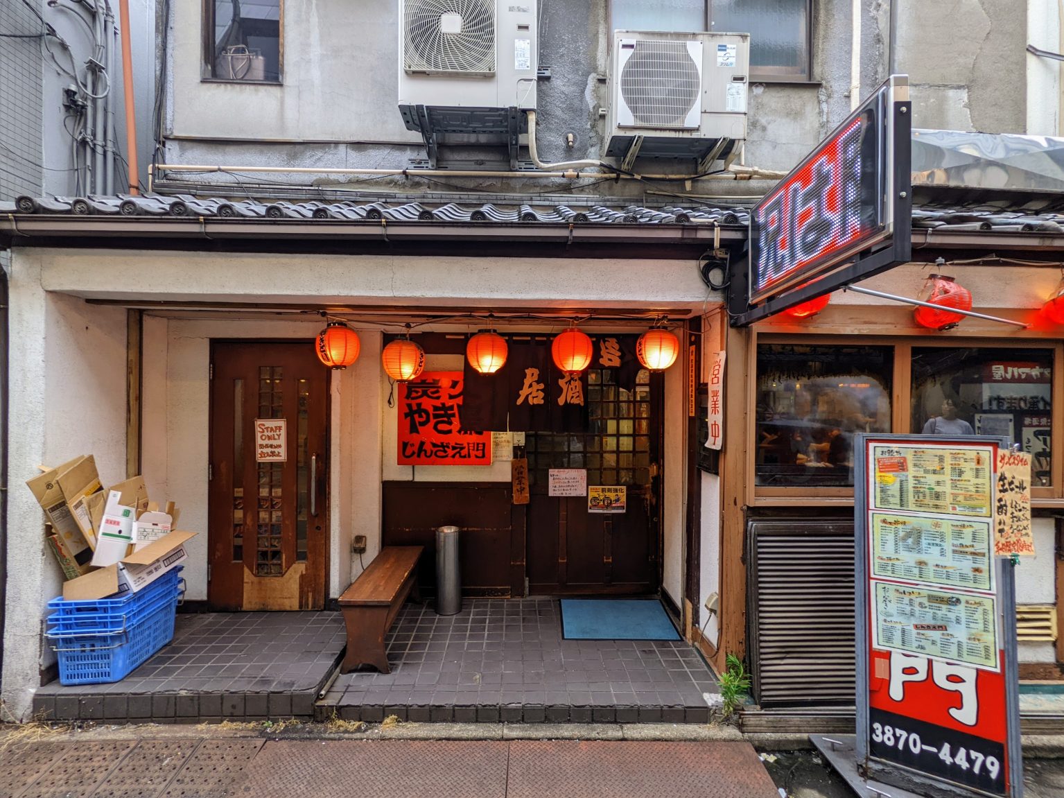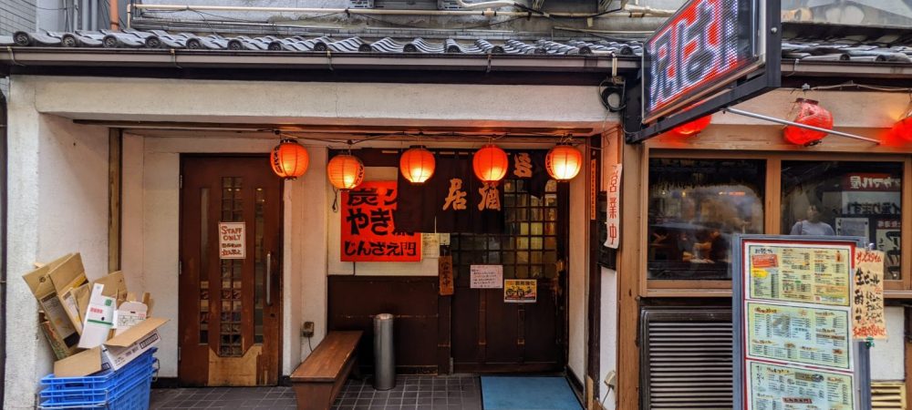 出たっ、『じんざえ門』だ! 北千住駅西口から歩いて数分の、何気ない横丁の一筋に、爛々と輝く赤提灯。営業時間は……14時からという頼もしさ! くぅぅぅぅっ、一番昼飲みしたい時間帯に、よくぞお招きくださった。モルタル建築自体に似つかわない瓦屋根の雰囲気が、この地で長いこと営ってらっしゃるという証。脊髄反射の如く、身体が勝手に暖簾を引いていた。