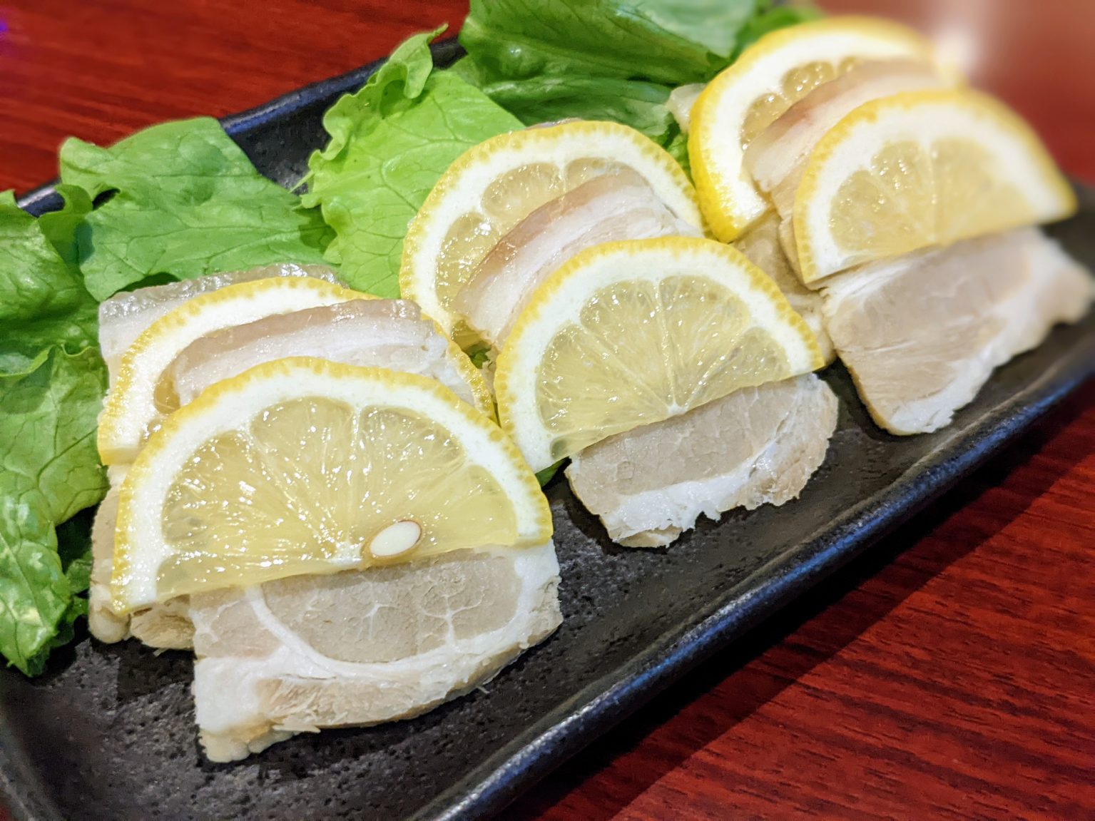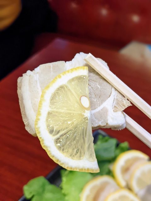 つづいて『豚肉の塩漬け』がやってきた。豚肉との間に半月レモンスライスが交互にサンドされ、高級フレンチの様相。肉肌が美しい豚肉は、なめらかな脂と塩のまろやかな丸みが繊維の隅々まで旨みがしみ込んでいる。