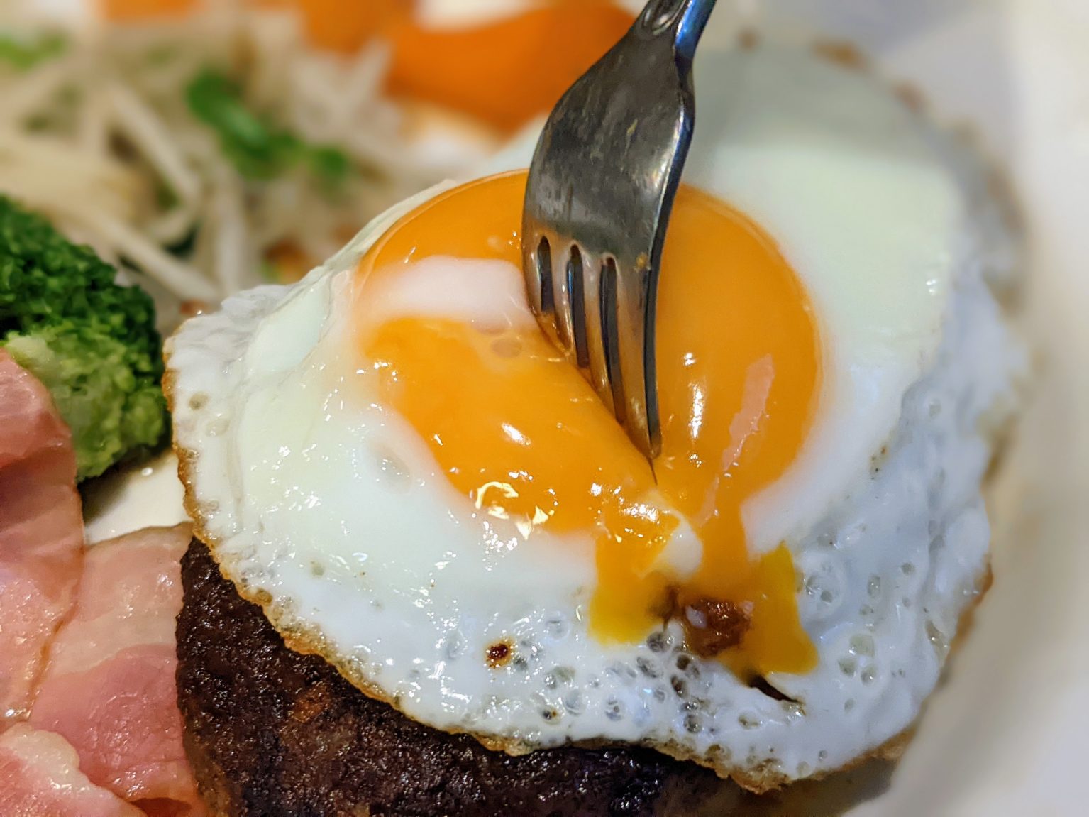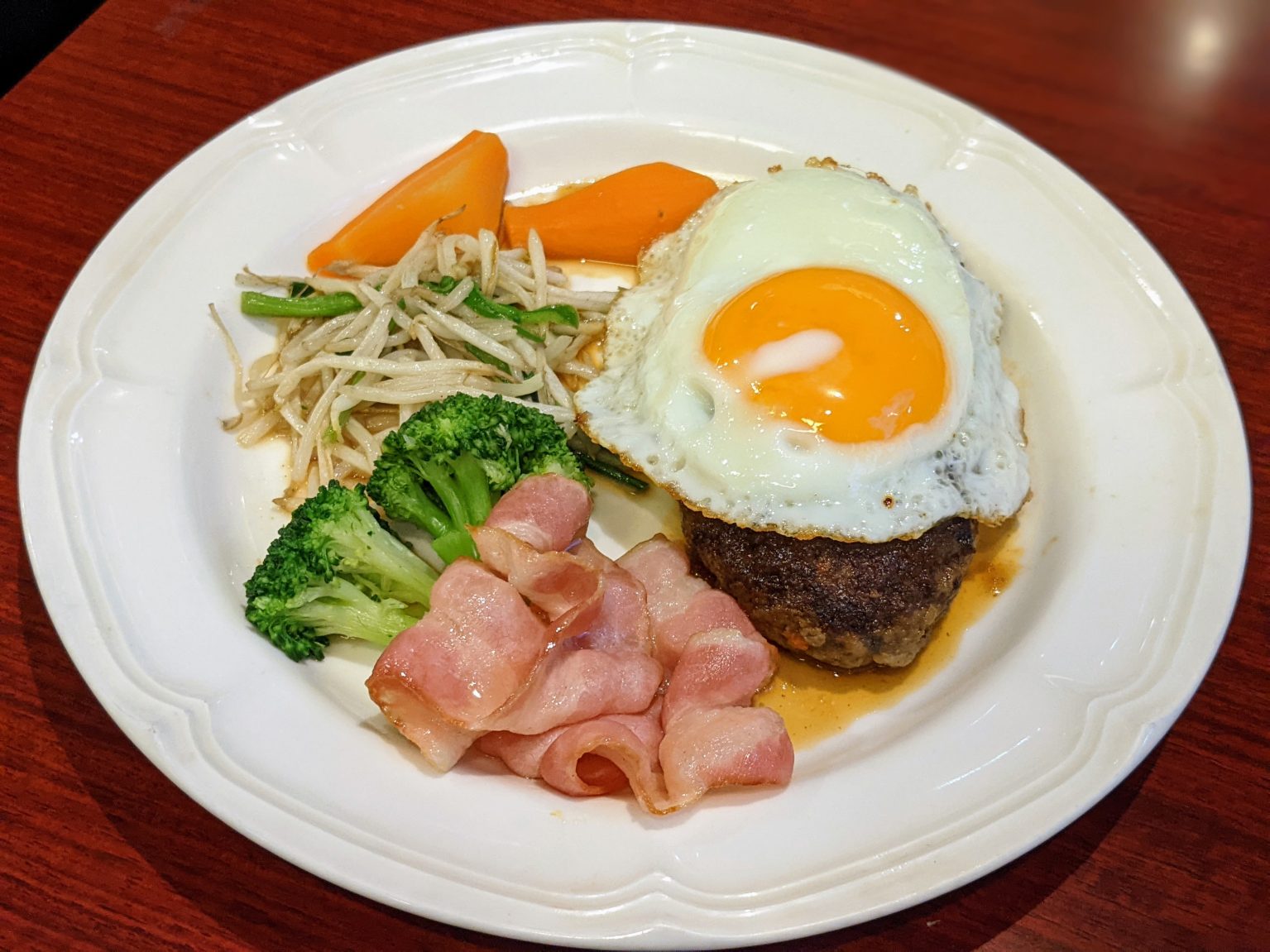 涙を拭いて、次の料理だ。純白プレートの半分に鎮座する『ハンバーグ』。その頂に輝く目玉焼きは、まるで伯爵サマの王冠である。家来のベーコン、ブロッコリー、もやし、そして人参が名脇役として彩りを添える。