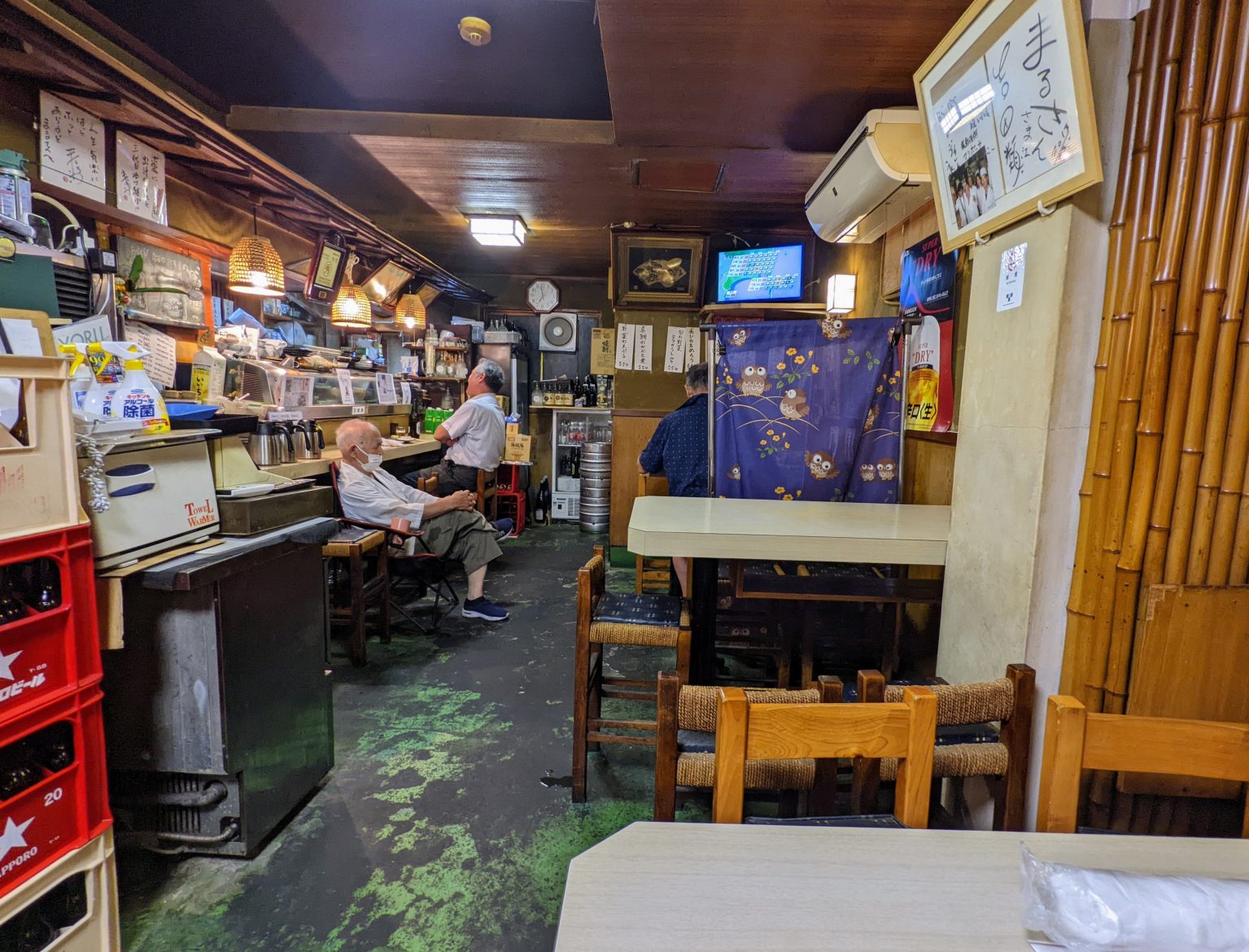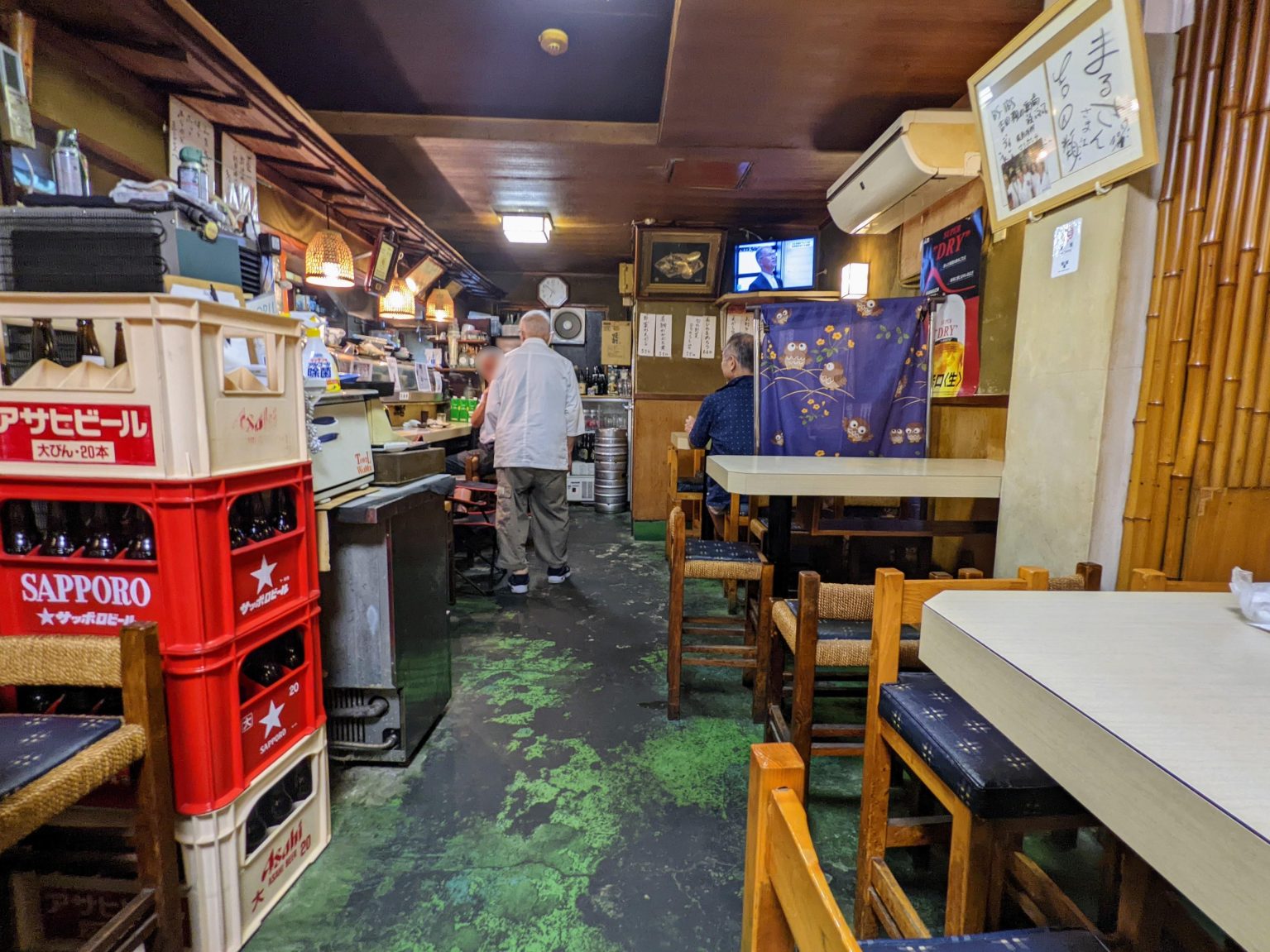 うわっ、シブいっ! 店内に足を踏み入れると、まず目に入るのは木のカウンターと、年季の入った緑がかった床。