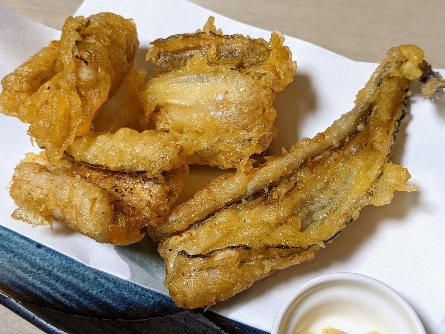 噛めばじゅわっと広がる芳醇な旨み、香ばしい衣が海の恵みを包み込む。添えられたおろしが味を引き締め、揚げたての至福が酒を誘い。