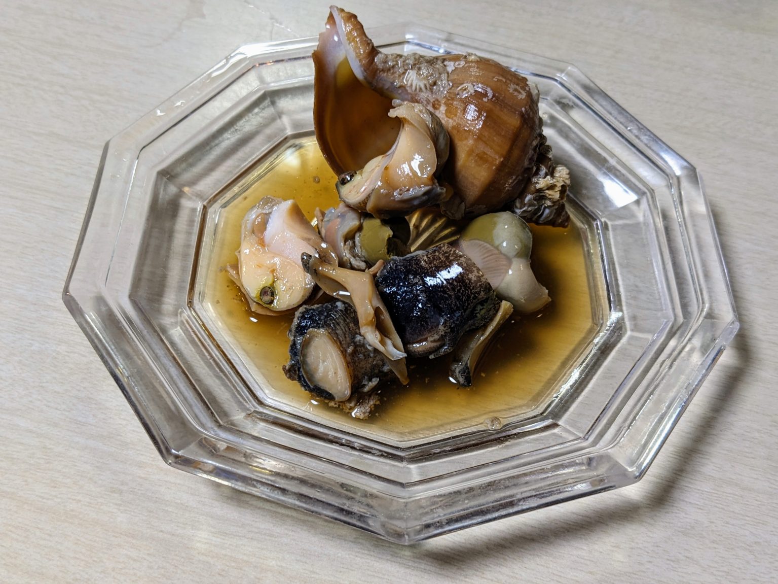 ガラス鉢にころりと並ぶ『味付けツブ貝』。コリッと弾む歯応えに、甘辛だれがじゅわっと広がり、貝特有の旨みがホッピーを誘う。
