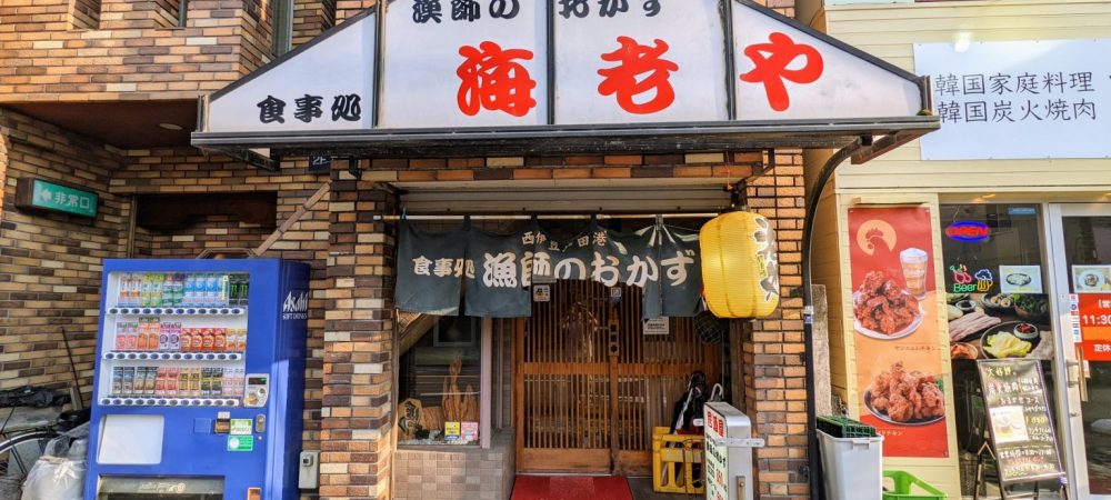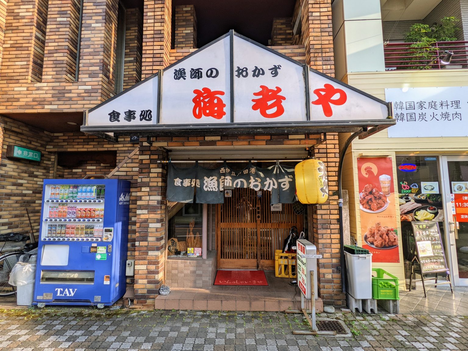 出たっ、「漁師のおかず 海老や」だ! まず目に飛び込んでくるのは、まるで港町の玄関のような三角屋根の看板だ。〝赤い 海老や〟の文字が、不思議と腹を鳴らす。横に鎮座した年代物の青い自販機がまた渋く、建物のレンガ色と調和し、昭和の匂いをしっとりとふりまいている。店の左右には他店の看板がずらりと並ぶが、この一角だけ時間の流れが停滞している。
