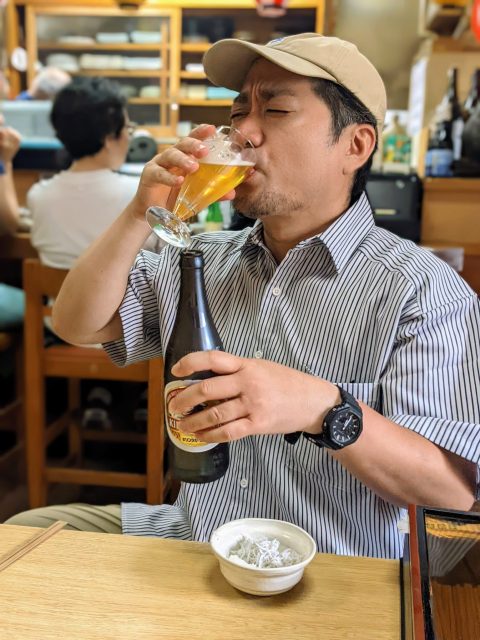 瓶ビールの無骨な佇まいに、珍しい三角グラスがカップルのよう。黄金色の液体が沸々と揺れ、まるで漁船の道しるべの灯台のように輝いている。