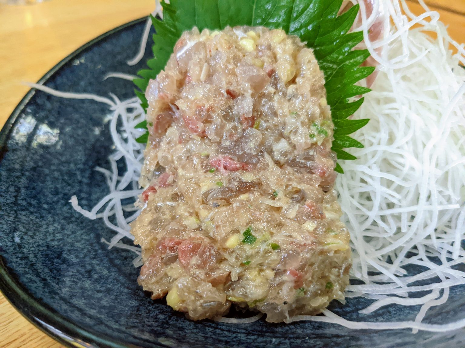 この『アジなめろう』を見た瞬間、千葉が本場という話が疑わしくなった。包丁で叩かれたアジはニットリとなめらかで、味噌のコク深い甘みが舌に心地よく残る。薬味の香りがぶわっと立ち、しばしの余韻が続く。