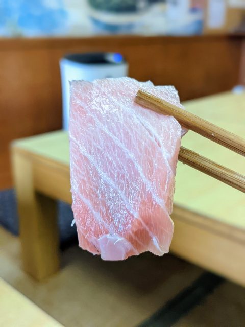 うわっ……私のマグロ(大トロ)』、輝きすぎ……? 今まで大トロだと思っていたものが冗談に思えるほど、濃密な脂がとろけるように広がる。