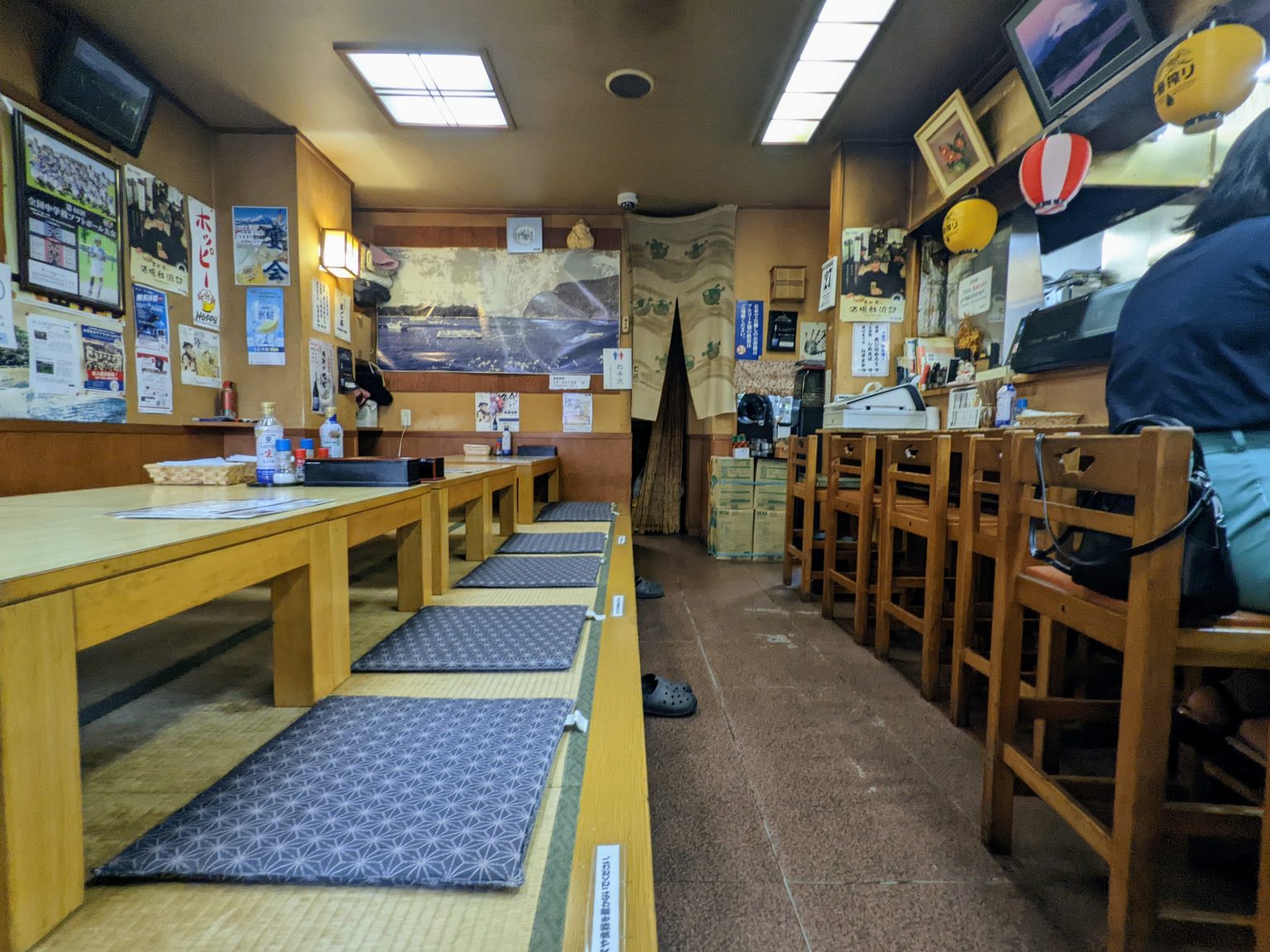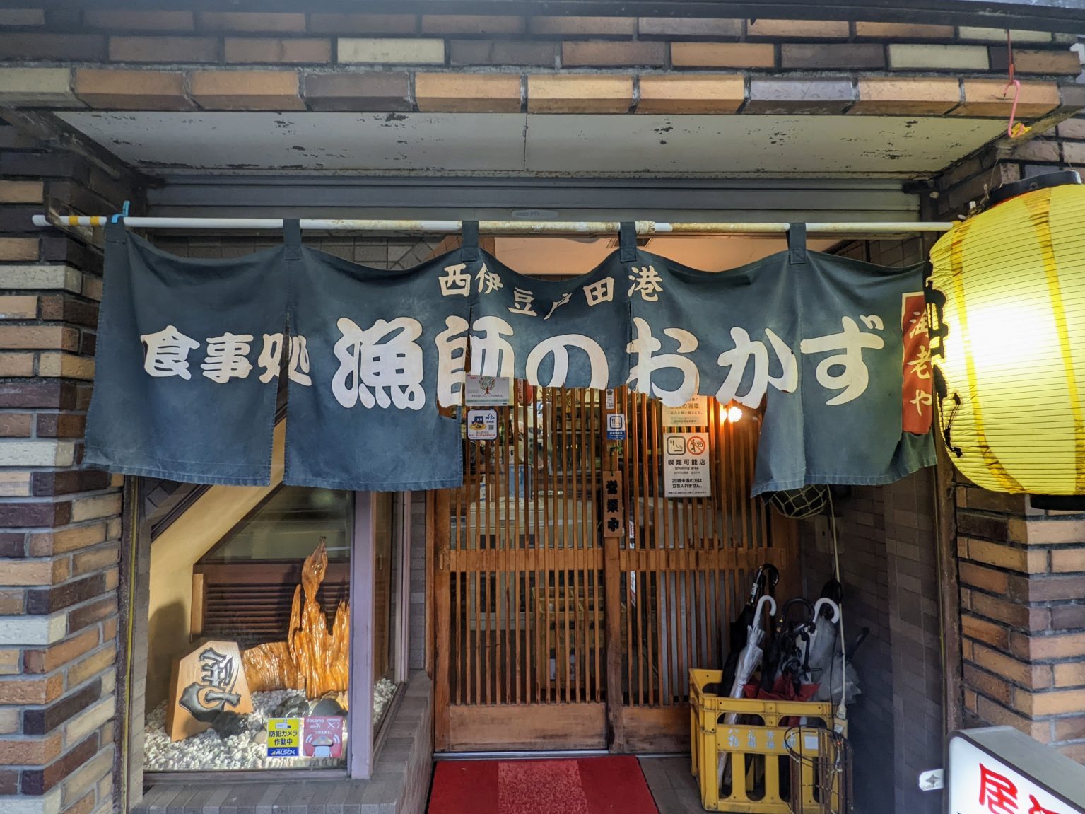 いいですねえ……自然と視線は深い藍色の暖簾へ吸い寄せられる。白い文字が、日焼けしてなお力強い。擦れた布地には、長年の海風の記憶がしみ込んでいるかのようで、横で灯る提灯が温かな光を添え、引き戸の木目が店の歴史をこれでもかと語る。さて……心の準備が整ったところで、そっと暖簾をくぐりましょう。