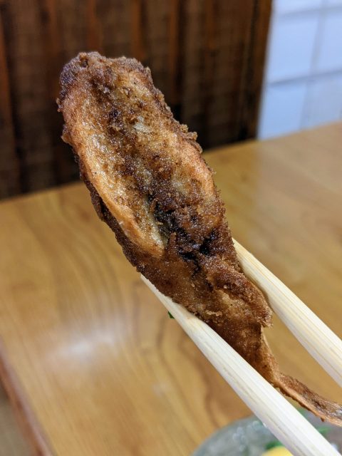 尻尾まで、骨の髄まで、全てを食べ尽くせる野趣あふれる絶品。まさに「ヒレ揚げ」とでも呼ぶべきか。白身の気品ある風味が口いっぱいに広がり、酒を加速させる。
