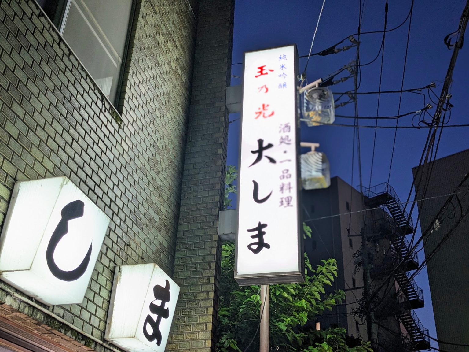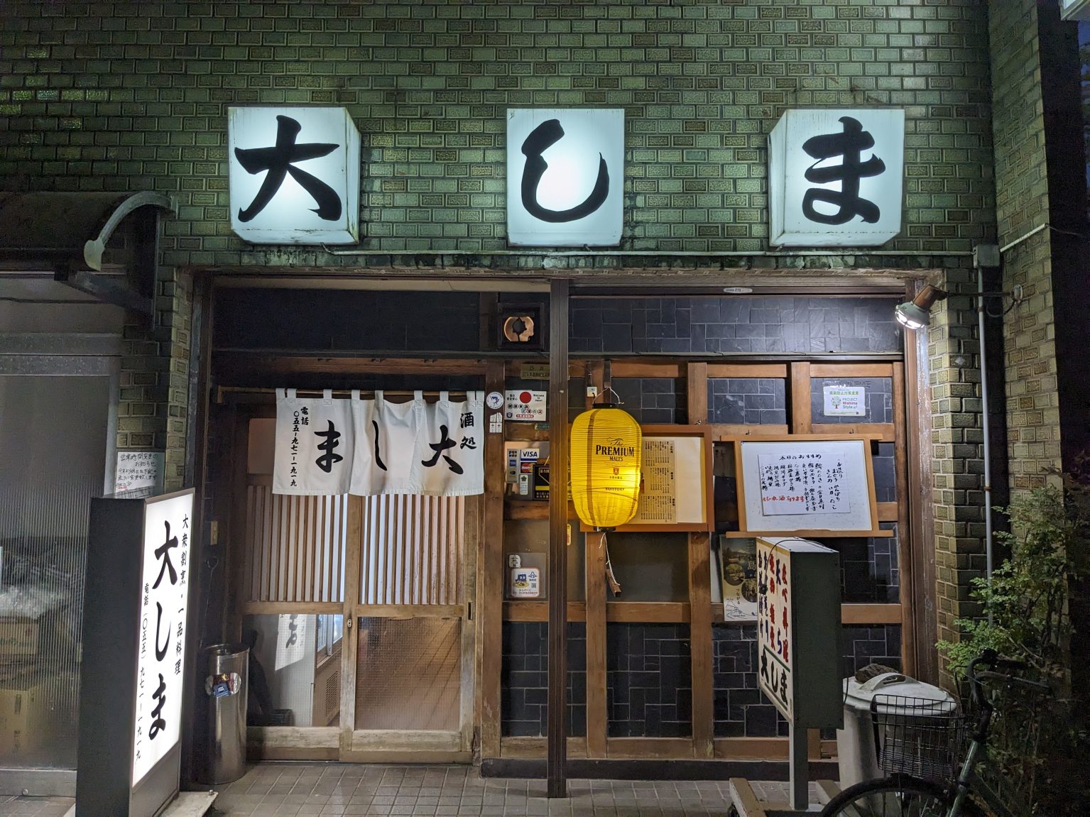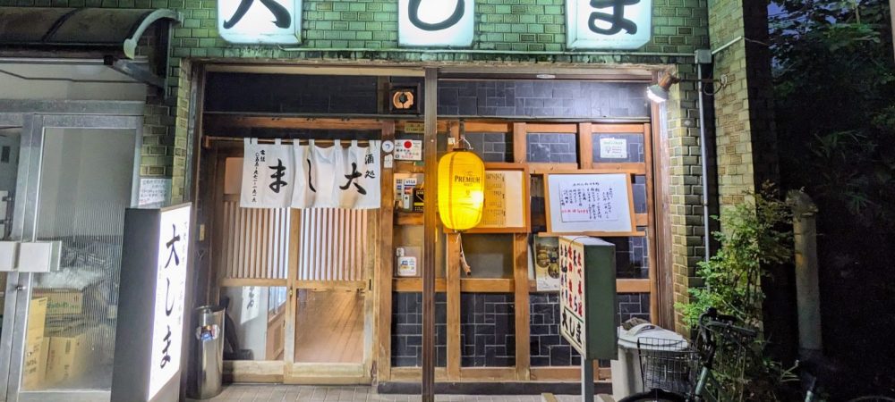 出たっ、『大しま』だ!夜の帳に浮かび上がる、整然と並んだ緑のタイル。そこに〝大しま〟という三文字が潔く躍る行灯が見えた瞬間、私の酒場センサーは確信を持って正解を告げた。